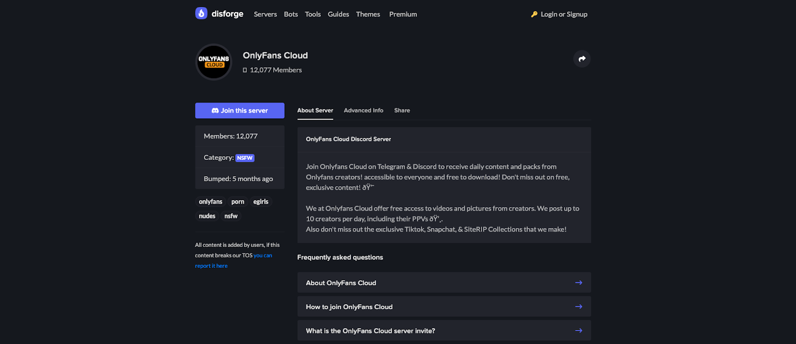 OnlyFans Cloud is a publicly listed Discord community where creators and fans share updates, discover content, and connect. This server has an established presence on Discord directories, making it easier to join and verify.