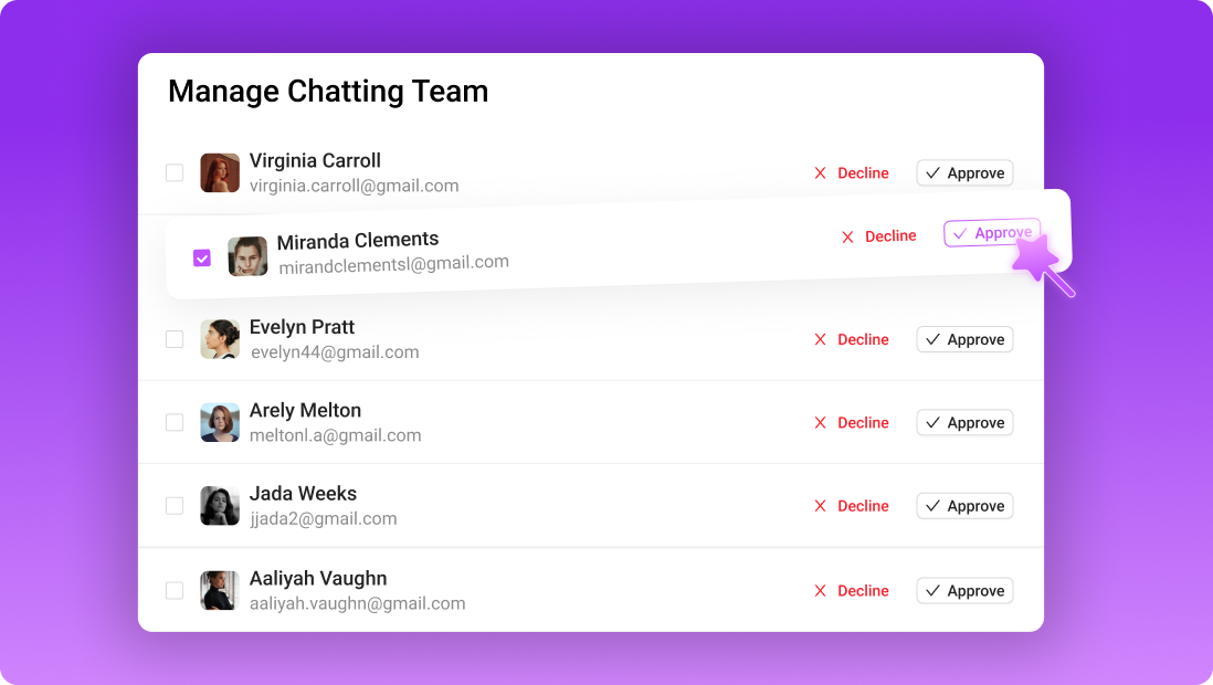 Invite chatters or managers, assign permissions, and organize your team for smooth operations.